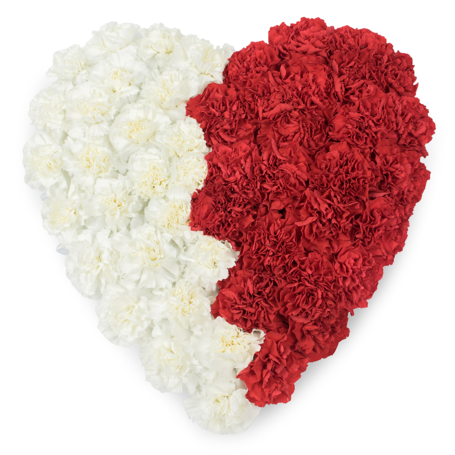 Our elegant heart-shaped bouquet features a harmonious mix of white and red carnations, thoughtfully arranged to convey love and sympathy. Each bloom is hand-selected for superior freshness.